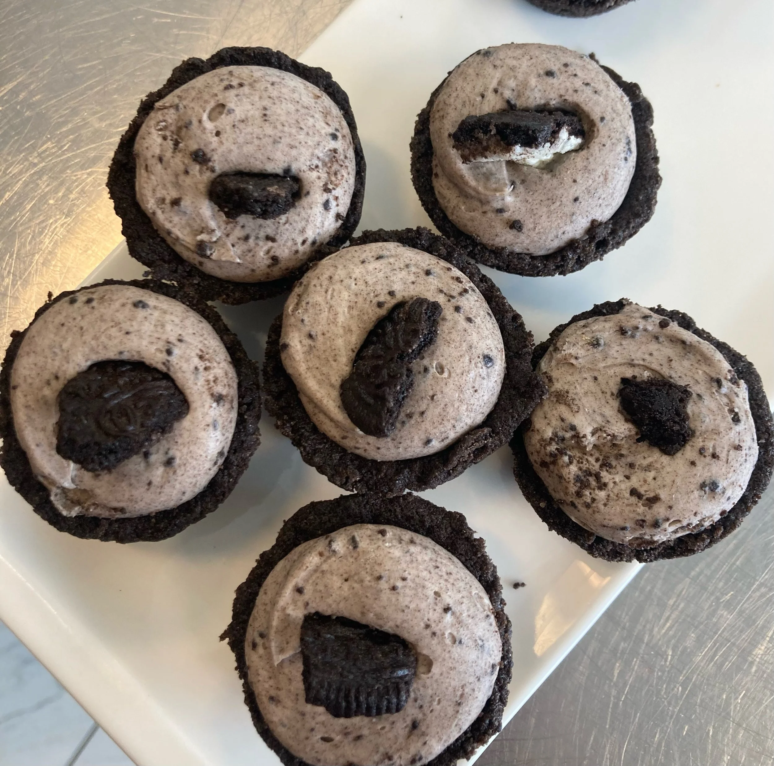 Chocolate cookie base, covered with a rich chocolate ganache with a white chocolate swirl